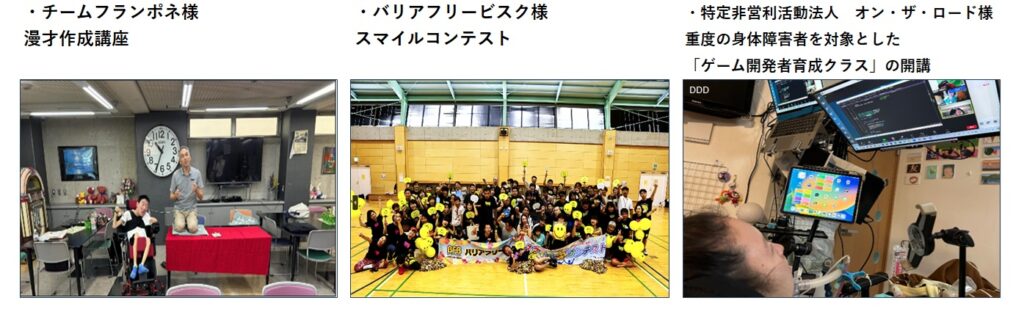 | 特定非営利活動法人 オン・ザ・ロード | 東京都 | 重度の身体障害者を対象とした「ゲーム開発者育成クラス」の開講 | 300 |
