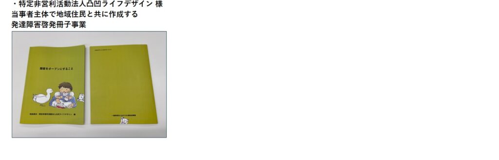 | 特定非営利活動法人凸凹ライフデザイン | 熊本県 | 当事者主体で地域住民と共に作成する発達障害啓発冊子事業 | 260 |