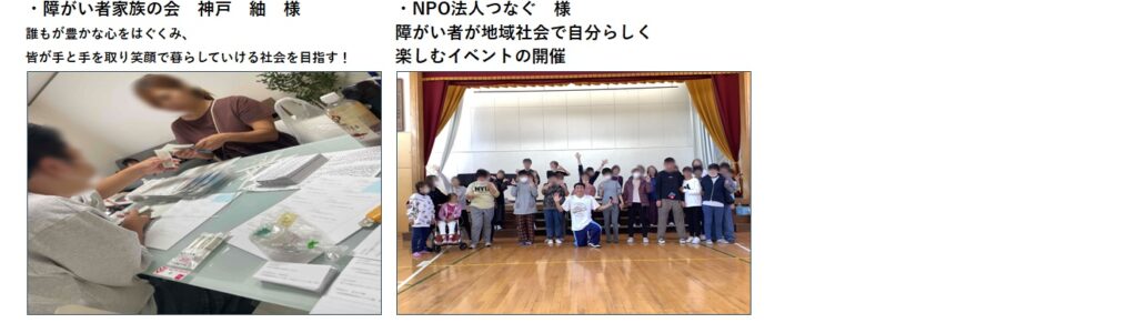 | NPO法人つなぐ | 神奈川県 | 障がい者が地域社会で自分らしく楽しむイベントの開催 | 300 |